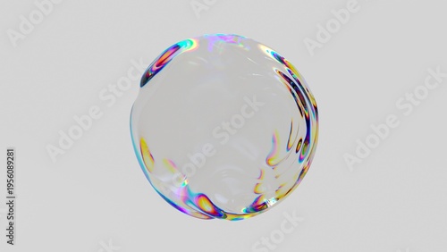 Abstract 3D render iridescent glass bubble with holographic liquid refraction. Fluid organic sphere with rainbow spectral dispersion, isolated on light background for modern futuristic design.