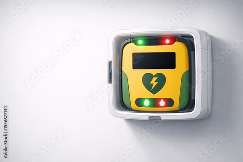Defibrillator AED Equipment for Public Health and Cardiac Emergency Resuscitation, Life-Saving Medical Safety Device for First Aid Heart Arrest Treatment Mounted on Wall