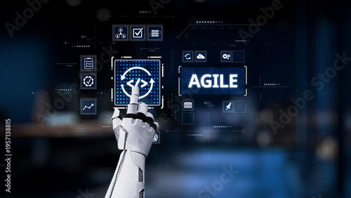 A robotic hand interacts with a digital interface representing agile methodologies and technological advancement, symbolizing innovation and effectiveness in businesses. Synapse