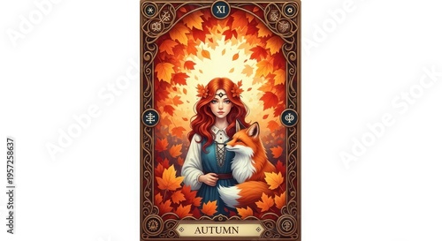A mystical woman surrounded by autumn leaves and a fox in a tarot card illustration