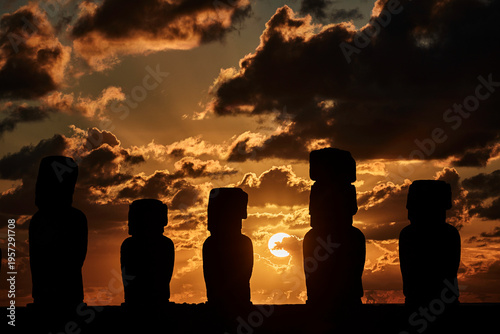 Silhouetten der Moai-Statuen bei Sonnenaufgang auf der Osterinsel