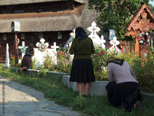 Rumunia, Maramuresz - stare kobiety modlą się na cmentarzu przy cerkwi w Leud