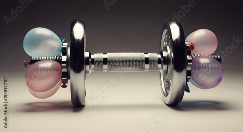 A gleaming chrome dumbbell tethered to delicate pastel balloons, creating a striking visual metaphor for the weightless ease of a positive mindset in the face of heavy physical challenges