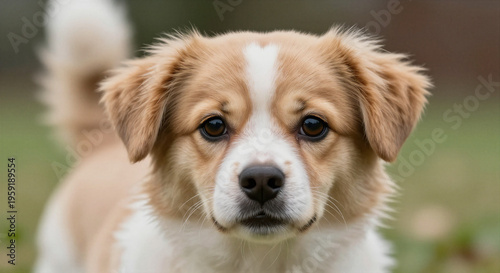 Close-up of adorable brown and white puppy looking directly at camera outdoors