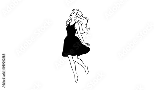 Title: Happy girl jumping in dress line drawing vector illustration cheerful concept