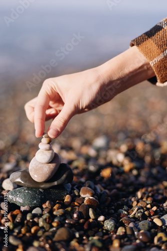 Stone stacking on a pebble beach with a hand placing balanced rocks, capturing calm focus, mindfulness and a tranquil seaside moment in natural light and gentle textures.