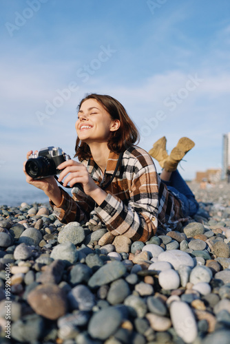 Photographer woman lying on pebbled beach, smiling with camera in hand, capturing moments outdoors, nature light, coastal scene, casual plaid shirt, relaxed hobbyist vibe and sunny shoreline mood