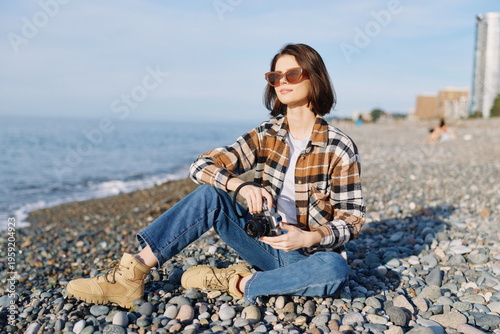 Woman photographer sits on a pebble beach with a camera, wearing a plaid shirt, jeans and boots, sunglasses and a relaxed casual look, exploring light by the sea.