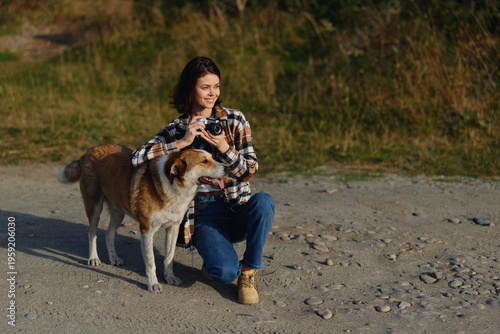 Woman kneels on a pebble beach, taking a photo with a camera while a large dog stands close, creating a warm moment of outdoor companionship and playful exploration.