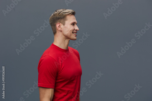 Smiling man wearing red t-shirt standing sideways against a plain gray background in a professional studio photo. Happy, confident, casual, portrait, fashion, lifestyle, positive energy.