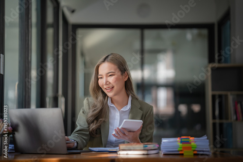 Smiling Asian businesswoman using calculator while working on laptop, financial planning.