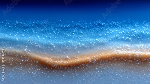Abstrakte Nahaufnahme einer Sandwelle mit Wasserperlen und tiefblauem Hintergrund