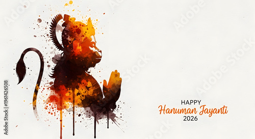 Hanuman jayanti celebration greeting card poster festival silhouette god monkey warrior prayer devotion watercolor paint splash text banner