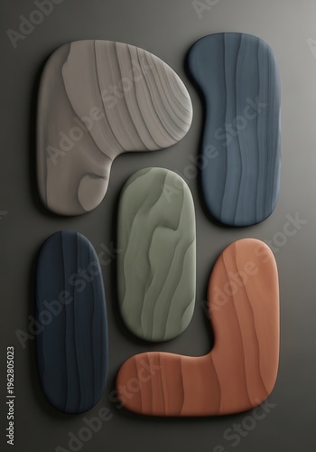 Stylized organic forms of varied colors and wood grain textures display
