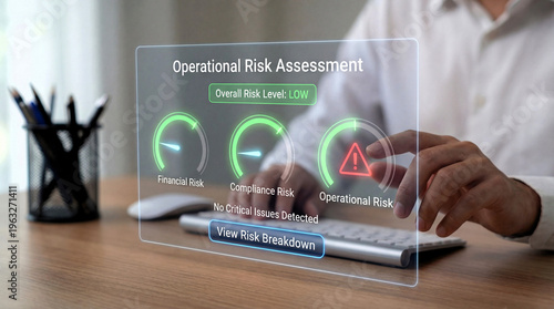 Businessman reviewing holographic operational risk assessment dashboard on desk