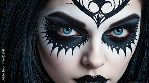 Gothic Makeup mit schwarzen Ornamenten und blauen Augen