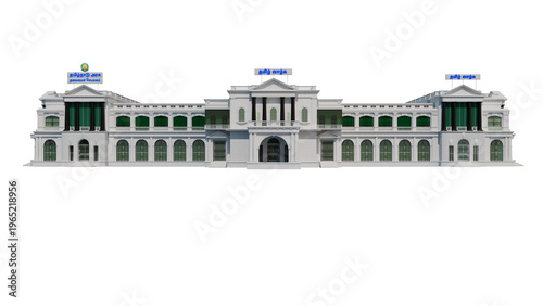 High-quality 3D transparent architectural render of the Tamil Nadu Secretariat building featuring classical colonial design elements, symmetrical structure, white façade, green window accents,