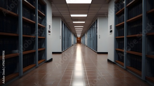 An empty long corridor in a library or archive lined with bookshelves and server racks receding into the distance
