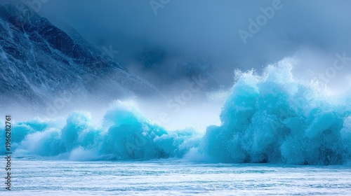 Potężna, turkusowa fala lodowa rozbija się o zamarznięty brzeg w surowym, zimowym krajobrazie górskim.