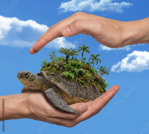 Duży żółw morski w dłoniach człowieka niosący na swojej skorupie egzotyczny las tropikalny jako symbol ratowania ginących gatunków