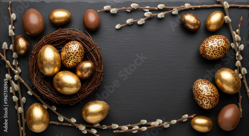 Elegant Easter background with golden eggs in nest, luxury chocolate eggs and pussy willow branches on black stone, festive holiday flat lay