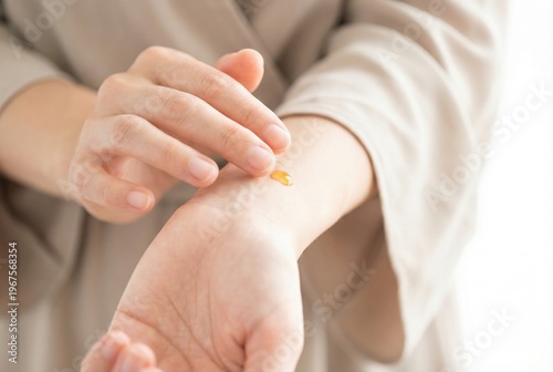 Woman applying a drop of golden essential oil serum onto her wrist