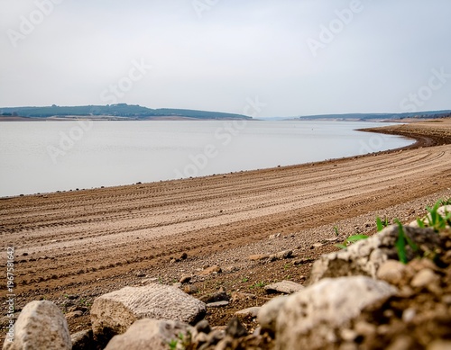 a reservoir during low water levels viewed from a high embankment. scarcity and environment themes. background with copy space