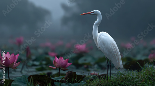 White bird lotus pond pink flower wetland water bird standing bird white plumage red beak long neck misty lake