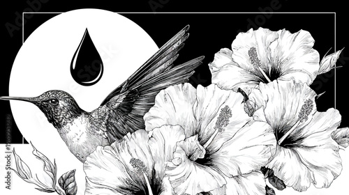 A grayscale illustration of a hummingbird, droplet, and hibiscus flowers in a stylized composition