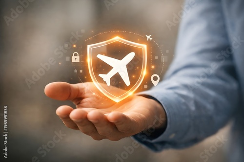 Businessman hand holding airplane and shield icon for travel insurance and flight safety concept