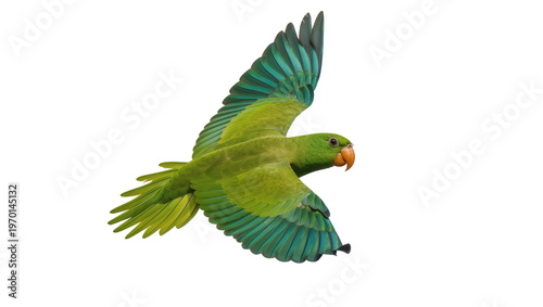 Vibrant green parrot mid-flight, displaying outstretched wings and orange beak