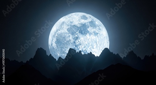 Giant luminous full moon appearing impossibly close over dark mountain peaks under a clear night sky