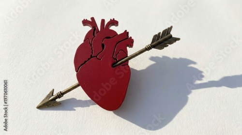 Red heart pierced by bronze arrow on white background
