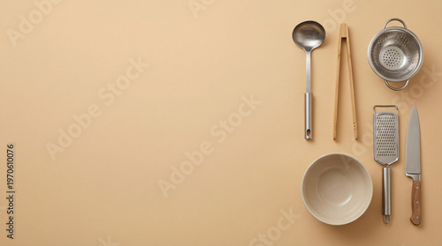 kitchen utensils on beige background, cooking tools, culinary essentials