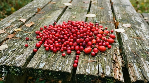 Collection of red berries on weathered wooden surface