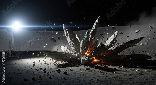 Jagged rock fragments erupting from impact on desolate lunar surface with fiery explosion