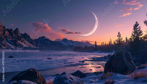 Serene Winter Landscape with Crescent Moon and Mountain Backdrop.