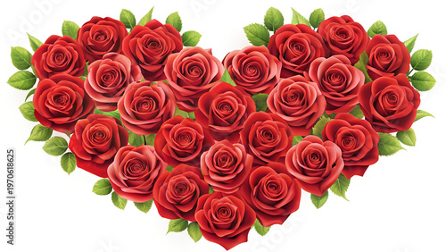 Beautiful floral heart shape arrangement made of many deep red roses and fresh green leaves isolated on clean white background symbolizing eternal love
