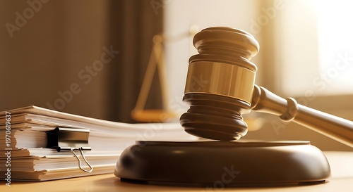Close-up of a gavel resting on its block beside a stack of legal documents