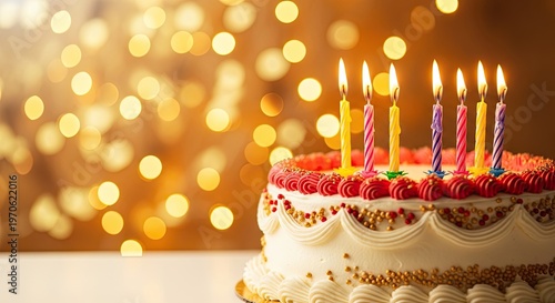 Birthday cake with lit candles and bokeh lights