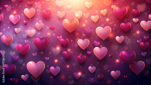 Abstract background with many pink and purple heart shapes and bokeh lights