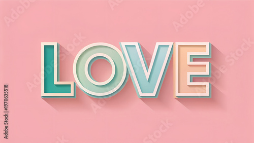 Retro 3d text effect spelling love in pastel turquoise mint and peach colors against soft pink background