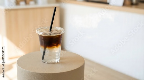 Cold americano with ice cubes placed on a natural surface under soft lighting, giving a relaxed and realistic coffee atmosphere.