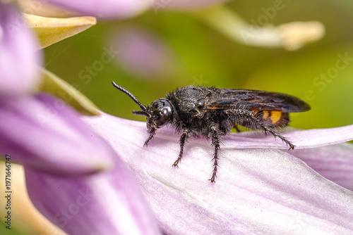 Makrofotografia smukwy kosmatej na fioletowym kwiatku hosty. Detale owada i przyrody w zbliżeniu. Idealne do projektów edukacyjnych, przyrodniczych i naukowych o bogatej bioróżnorodności.