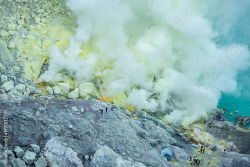 Sulfur fumes from the crater of Kawah Ijen Volcano in Java island of Indonesia. This notorious sulphur mines are located down in the crater of the active volcano Kawah Ijen in East Java, Indonesia.