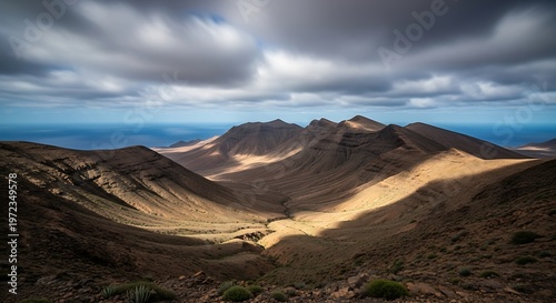 Dramatic landscape of mountain range under cloudy sky with sea horizon