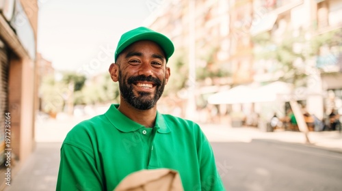 Delivering Smiles: A Happy Delivery Person with Green Uniform and Bag.