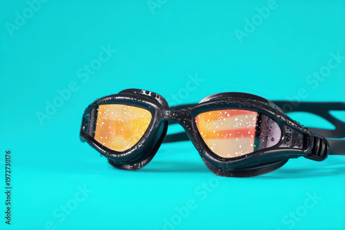 Swimming goggle lens with water droplets on black frame, reflecting warm colors on turquoise background, minimal style macro shot showing detailed texture and clarity