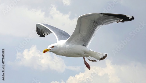 A white seagull flying in a blue sky with fluffy clouds
