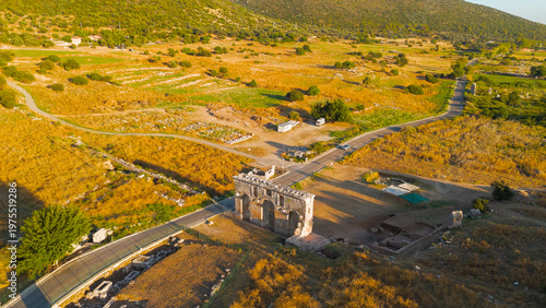 Gelemis, Turkey. Monumental triumphal arch of Mettius Modestus, roman governor memorial gate in Patara ancient city archaeological zone. Aerial View